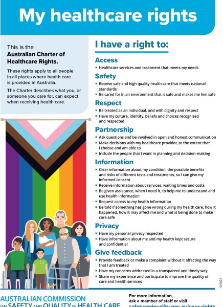 These rights apply to all people in all places where health care is provided in Australia. The Charter describes what you, or someone you care for, can expect when receiving health care.